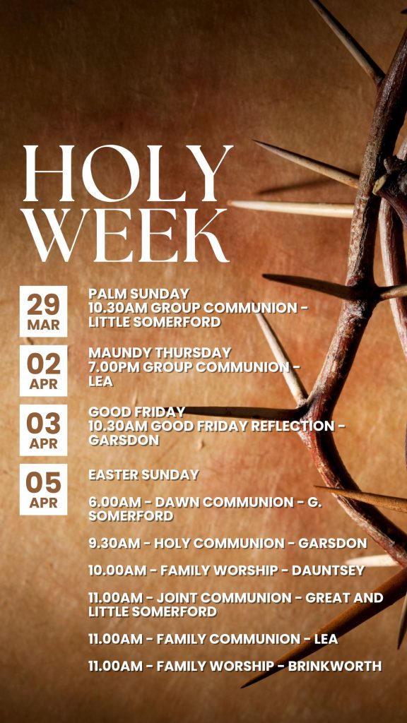 We are part of the North Wiltshire Deanery which in turn is part of the Diocese of Bristol. The six churches, based in the villages of Brinkworth, Dauntsey, Garsdon, Great Somerford, Lea and Little Somerford offer a variety of worship styles from traditional Book of Common Prayer through to very informal contemporary praise. We form part of the Athelstan Pilgrim Way.